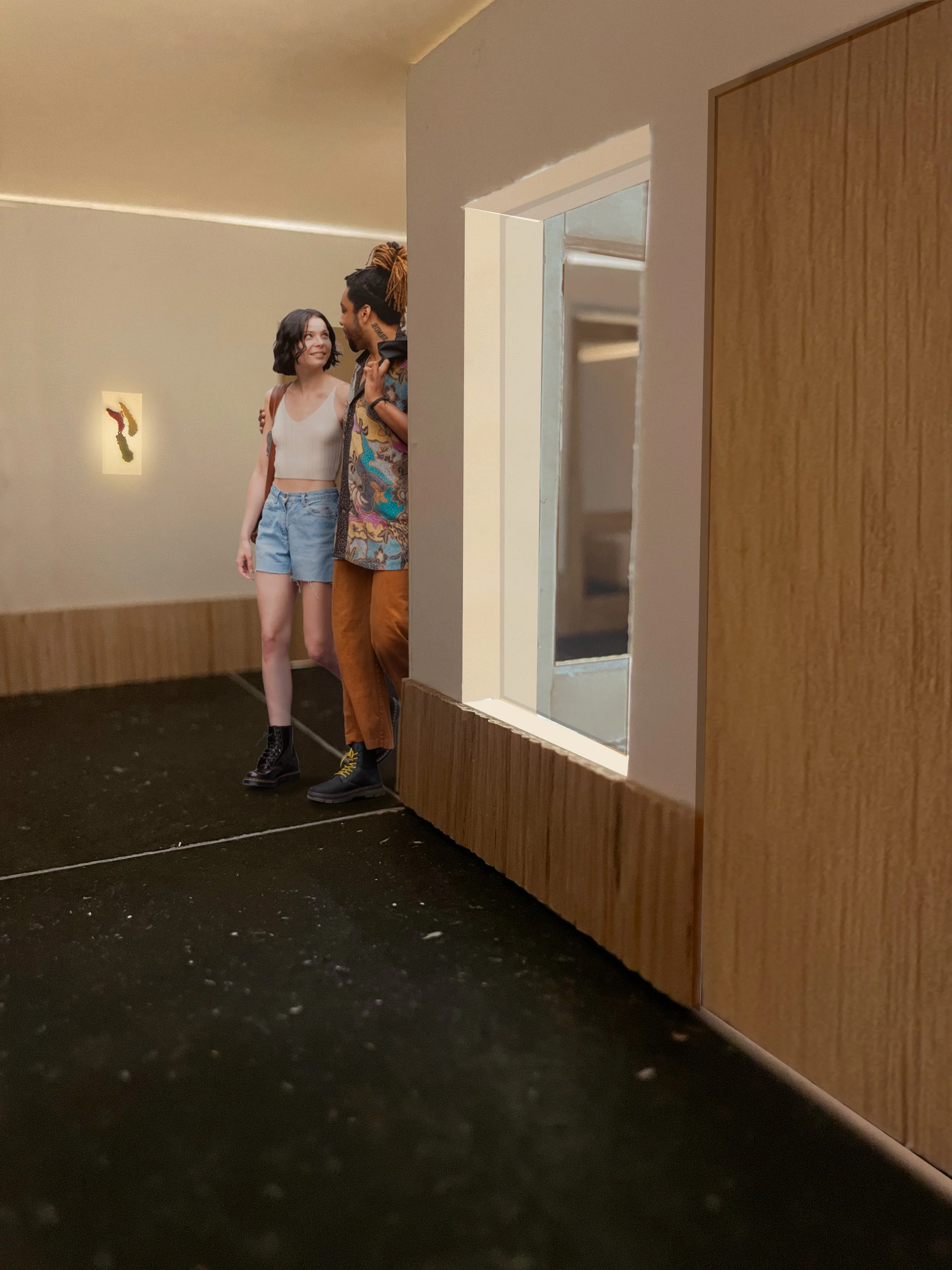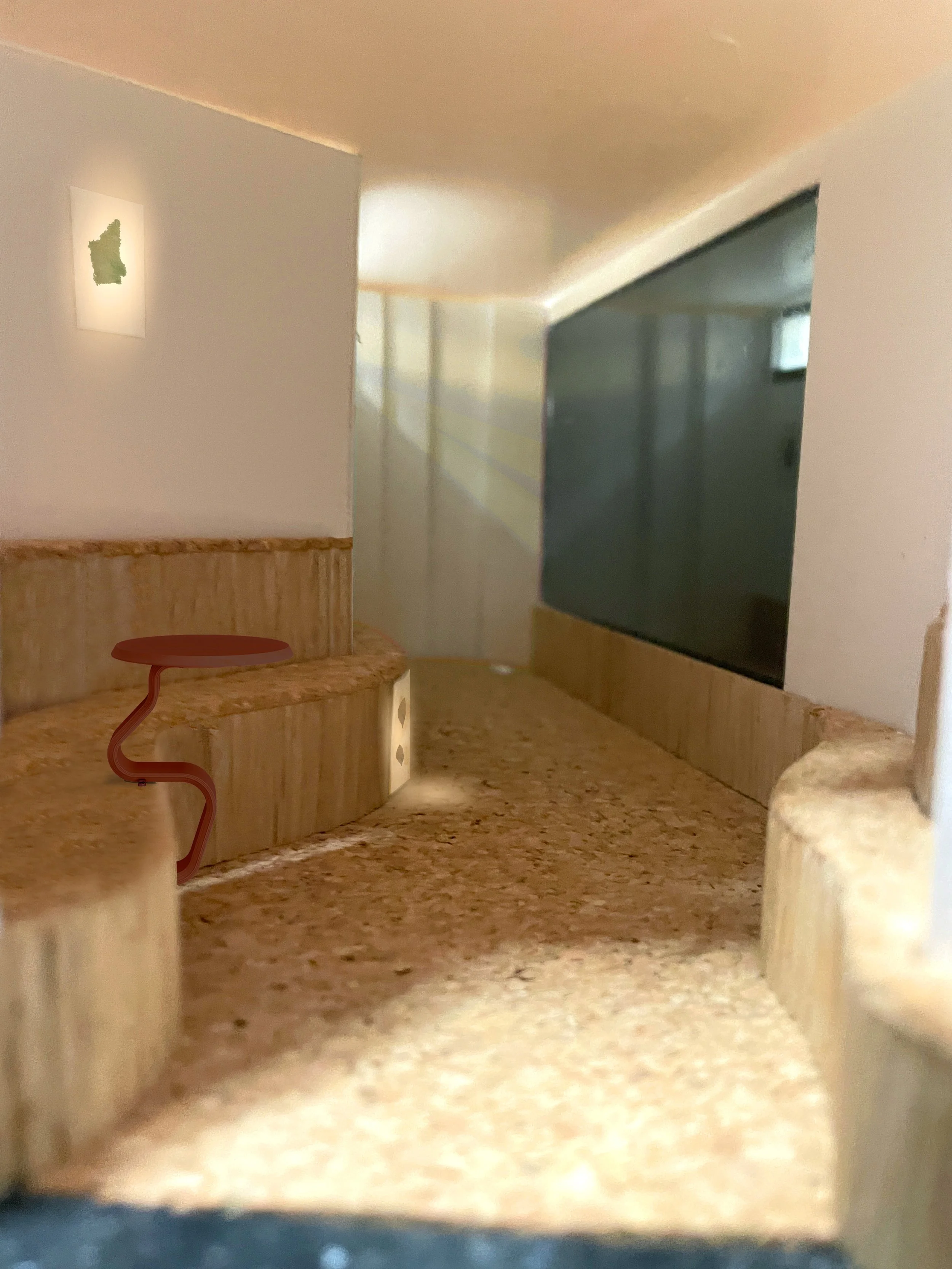 Detta förslag låter passagen bli något mer. Ett rum att röra sig genom långsamt, att vila i, att låta blicken dröja vid växterna. Här kan man vänta på sin stund, eller lyssna till ekot av andras. Interiöra fönster och speglingar, reflektioner av ljus, kakel och pressade växter öppnar korridoren mot världen utanför. Små antydningar om aktiviteter som pågår, liksom om årstiderna utanför.