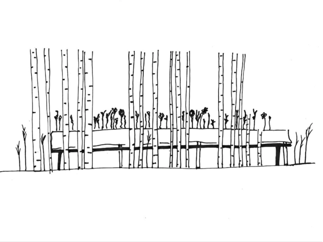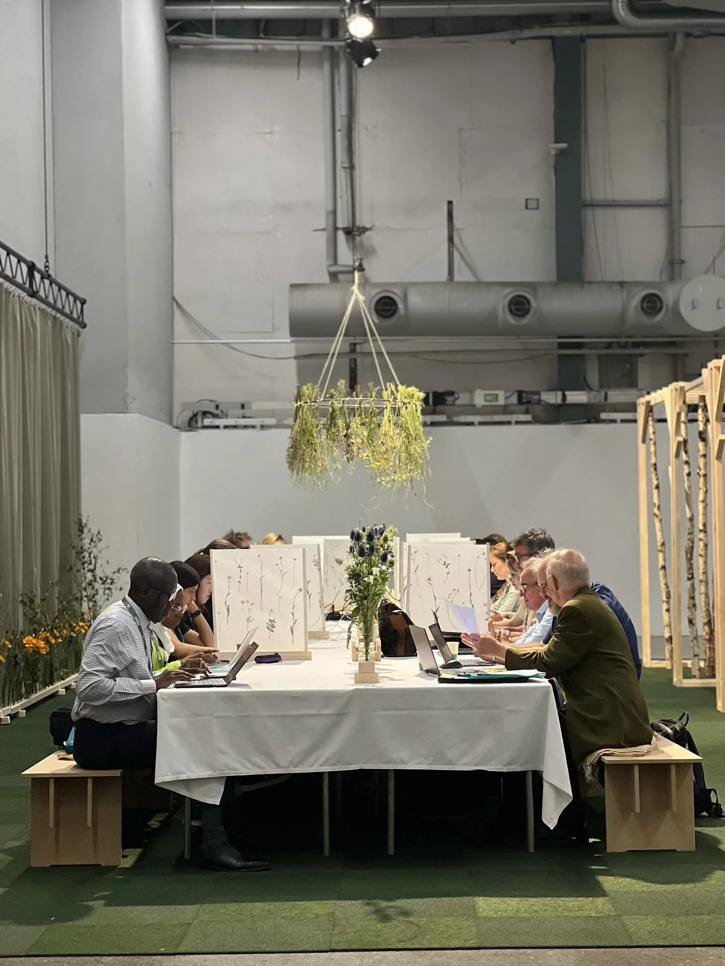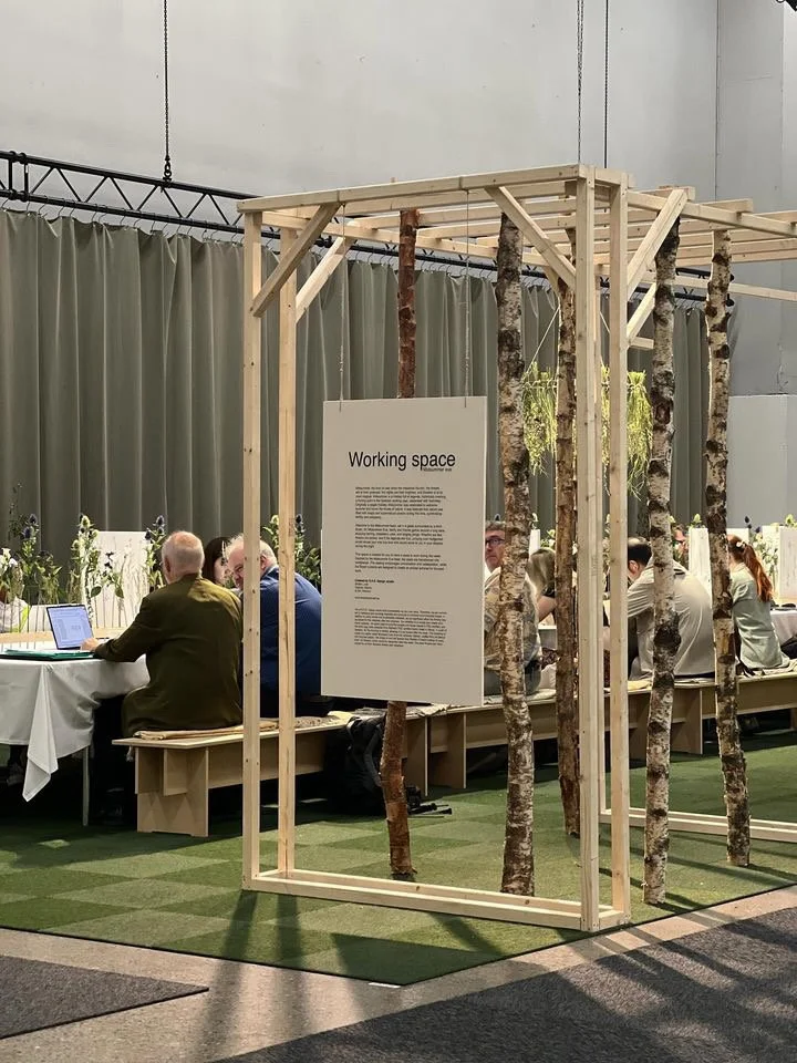 Mitt i sorlet från mässhallen på Stockholmsmässan i Älvsjö uppenbarar sig en björkdunge med ett dukat långbord med arbetsplatser, avskärmade med sju sorters blommor för privata sfärer för fokus och stillhet i det offentliga — likt en glänta i skogen.